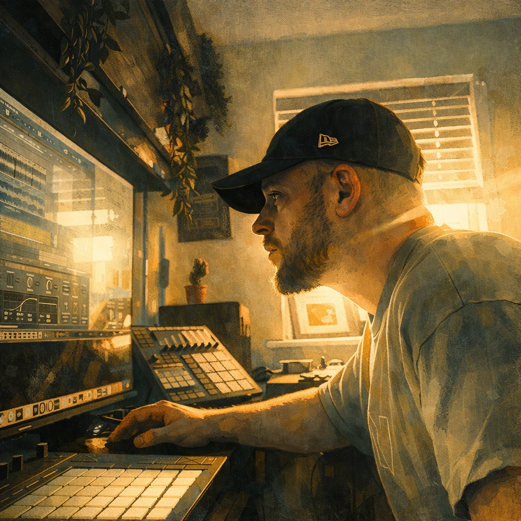 This video captures moments from the creative process — sound design, arrangement, and experimentation — as the track evolves into its own atmospheric, downtempo-infused interpretation. Expect warm textures, dusty tones, and emotionally driven electronic elements blending hip-hop influence with cinematic mood.